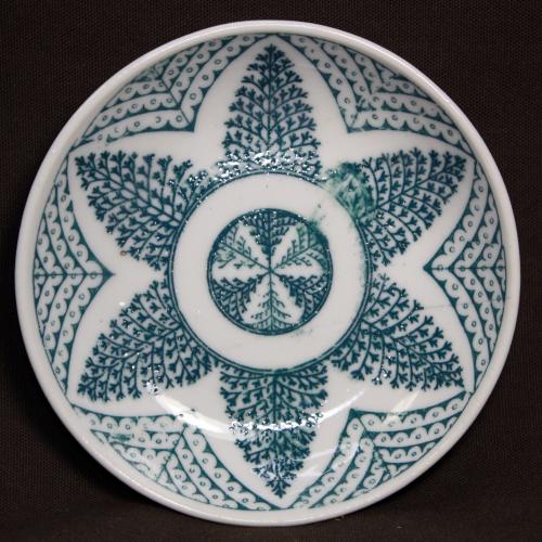 印判皿は、布染めなどに使われる型紙を使いプリントして焼きつける方法で作られております。